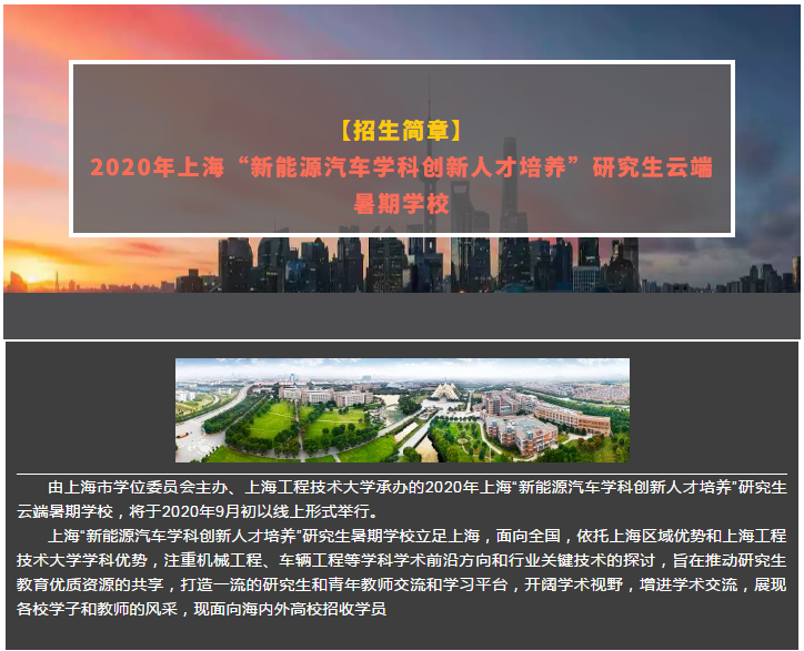 暑期以来,新葡的京集团3512vip组建研究生暑期学校筹备工作小组,积极推进2020年上海“新能源汽车学科创新人才培养”研究生云端暑期学校筹备工作。假期间,暑期学校筹备工作小组成员牺牲休息时间,多次加班召开线上或线下会议,谋划组织开展学员招募、专家邀请、对外宣传、学术论坛等一系列准备工作,并定于2020年9月1日—10日以线上形式举行。