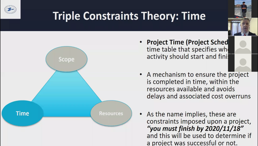 讲座中Patrick Lynch教授着重强调了“三重约束理论”:范围、时间和资源,其中范围目标需要明确这个是项目试图完成什么。时间目标需要明确需要多长时间完成。资源目标需要明确他应该花费多少。最后指明里其关系:最多可以限制两个维度,并举反例当客户把重点放在三者之间,便构成了一个失败的案例。