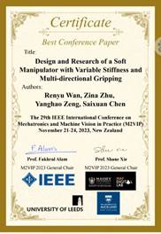 The IntelligentCollaborative Robotics Research Team from the School of Mechanical andAutomotive Engineering at Shanghai University of Engineering Science won theBest Paper Award for their paper titled Designand Research of a Manipulator with Variable Stiffness and Multi-directionalGripping. The first authorof the paper is mastersstudent Wan Renyu, under the supervision of Zhu Zina and Chen Saixuan, amongothers.