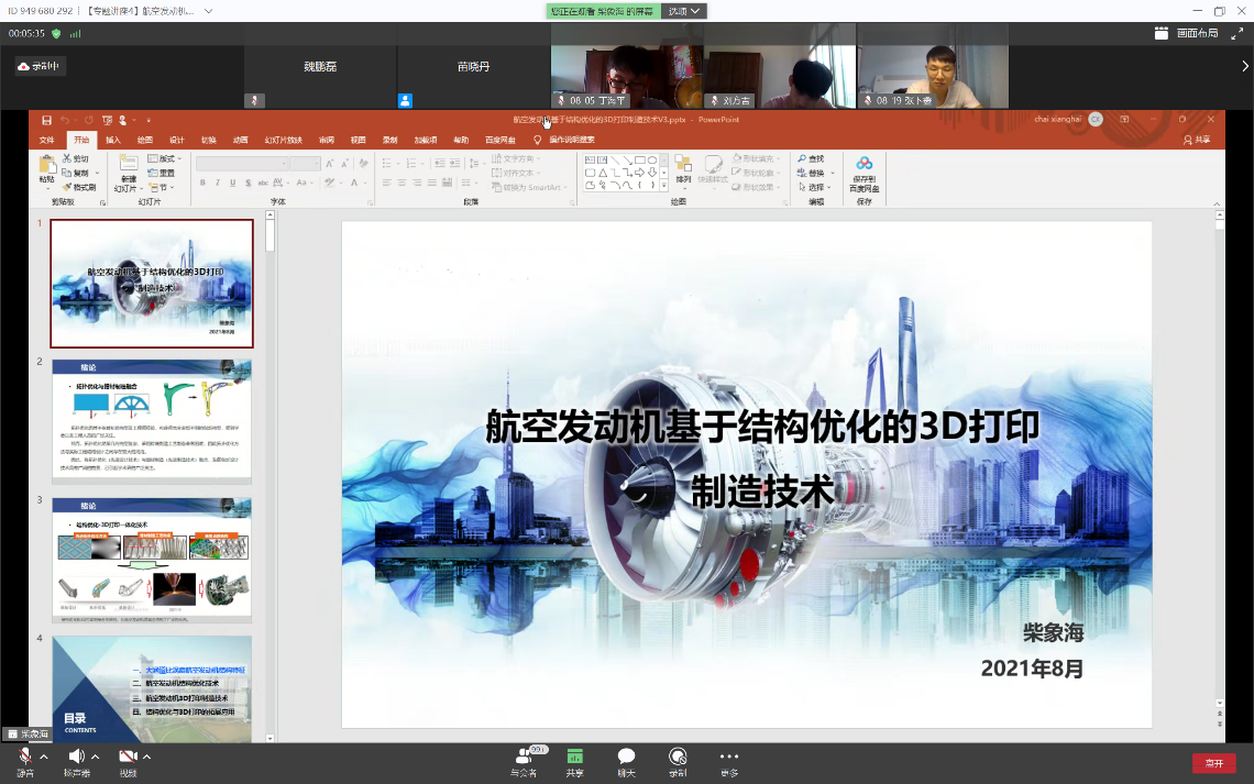 2021年8月29日14:00-16:00,通过华为云会议视频平台,中国航空研究院上海分院研究员级高工、主任设计师柴象海为暑期学校做题为《航空发动机基于结构优化的3D 打印制造技术》的线上专题讲座。讲座由新葡的京集团3512vip副教授苗晓丹主持。
