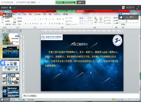 新葡的京集团3512vip为增进学员对我院特色专业的了解,分别在8月30日下午和9月3日上午,通过华为云会议平台,开展了学科与专业介绍的活动。由朱姿娜老师介绍了机电专业的详细情况;苗晓丹老师介绍了智能制造的详细情况;任红娟老师介绍了汽车工程系和汽车服务工程系的基本情况。活动内容主要包括学科与专业的建设情况、招生情况、科研团队的情况以及导师的详细信息介绍。通过两场学科与专业的介绍,加深了学员对我院建设的印象,促进了新生对学院及导师情况的了解。