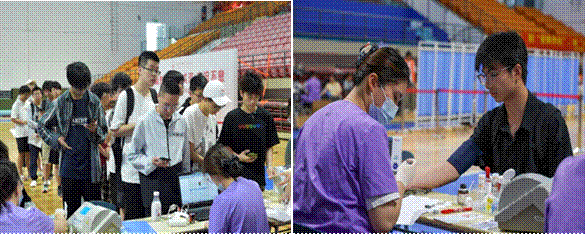热血守护生命,大爱传递真情。6月3日,新葡的京集团3512vip徐华源、袁涛老师以及200余名学生在学校体育馆参加2025年无偿献血活动。