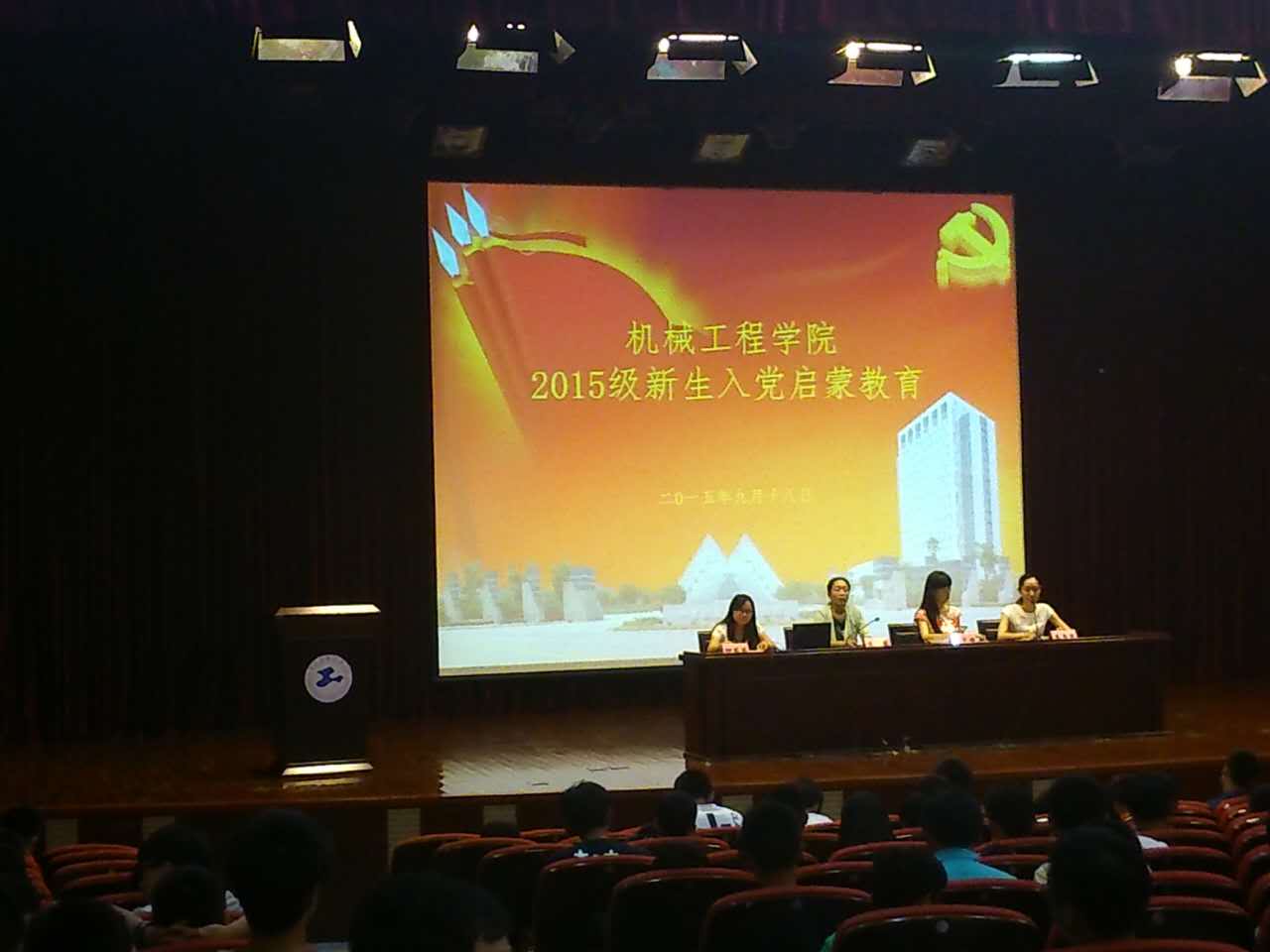 2015年09月18日下午,新葡的京集团3512vip机械工程学院党委在志宏堂召开2015级新生入党启蒙教育大会,学院党委书记虞蓉、副书记梅元媛、学生科创党支部柳苗苗以及组织员李雪苗出席会议。