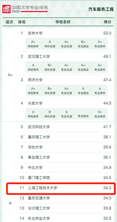 2022年6月18日,高等教育评价专业机构——软科正式发布了2022“软科中国大学专业排名”,排名包括568个本科专业,每个专业榜单发布的是所有开设该专业的高校中排名位列前50%的高校,共有990所高校的30242个专业上榜。“软科中国大学专业排名”是迄今为止覆盖专业数量最多、参评专业规模最大的中国大学本科专业排名,为学生报考志愿,了解专业发展起到了重要的参考作用。其中在全国101所学校参评的汽车服务工程专业的评选中,新葡京官网新葡的京集团3512vip的汽车服务工程专业排名第11名,连续第二年进入前10%行业,排名为列A级行列。