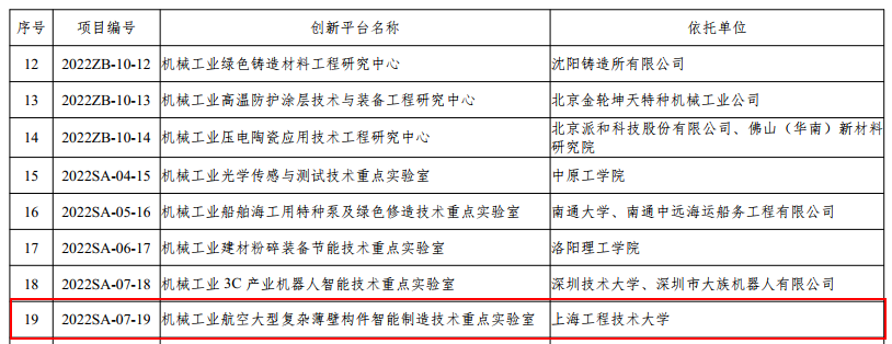 同时获批的机械工业航空大型复杂薄壁构件智能制造技术重点实验室,由刘钢教授担任实验室主任。该重点实验室面向航空航天等高端装备的大型复杂薄壁构件智能制造关键技术领域,聚焦超大曲面薄壁结构件精密加工、复杂结构件高强激光连接与增材制造、大型构件智能制造机器人技术与装备、大数据驱动的薄壁构件数字化制造技术等方面的基础理论与方法、关键技术研究及应用推广,立足上海,面向长三角,辐射全国,努力建设成为大型复杂薄壁构件智能制造领域技术领先、特色鲜明、产学研协同创新的行业共性关键技术科研平台,促进校企合作形成多项具有自主知识产权的核心专利技术,引领并支撑行业高端产品研发和原始创新。